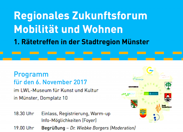 Wochenlang haben wir im Netzwerk geplant und diskutiert, am 6. November war schließlich die Bühne bereitet für das „Regionale Zukunftsforum Mobilität und Wohnen“. Die Ratsmitglieder aus Münster und den elf umliegenden Gemeinden waren eingeladen, sich zu den drängenden Themen auszutauschen, die die Stadtregion in den kommenden Jahren beschäftigen werden: zu intelligenten Verkehrslösungen und preiswertem Wohnen, aber ebenso zu einer gemeinsamen Vision oder schlicht und pragmatisch zu den Lieblingsorten der Teilnehmer. Was zu lebhaften Diskussionen in zwölf Themengruppen führte, war eigentlich ein Trojanisches Pferd.
