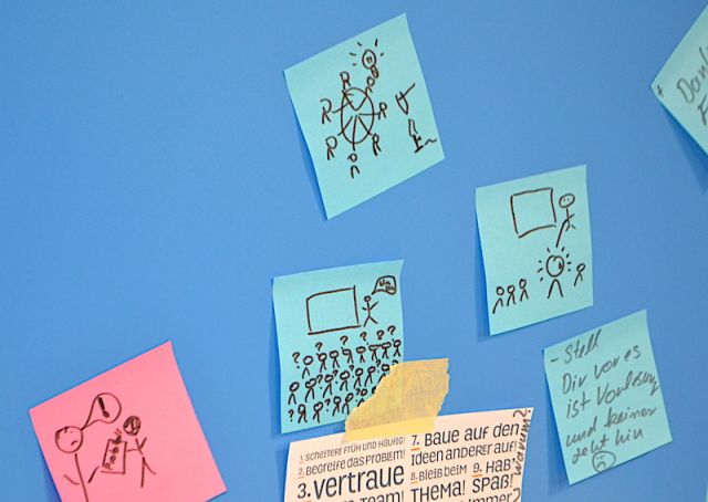 Andersherum funktioniert es auch: Beim Visual Talk, einer typischen Einstiegsübung, zeichnen die Teilnehmer ihre persönlichen Geschichten. Jede und jeder hat schon gedankenlos in alte Schulhefte gekritzelt. Der typische Einwand, der dennoch immer kommt: „Ich kann nicht zeichnen.“ Nur fünf Minuten später sind auf den Zettelchen kleine Geschichten entstanden, und die Teilnehmer sind mitten im Thema gelandet.