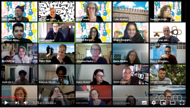 - Die Social Mafias (Jenny Wase, Ximena Durán, Anupa Dasgupta, Nachiket Akhave, Donna McDonnell, Lisa Marie Corley, Mimp Jiamton und meine Wenigkeit) als Gruppenmoderatorinnen und Stimmungstreiber. Gut zu erkennen im Stream an den psychedelischen Mustern, die der virtuelle Bildhintergrund über die Gesichter legt.