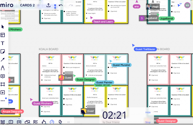 Nach reichlicher Erprobung im Echtbetrieb habe ich meine vorläufigen Favoriten gefunden. Das Konferenz-Tool meiner Wahl ist ohne Einschränkungen Zoom: läuft flüssig, saugt den Akku nicht umgehend leer, lässt sich locker und ohne Verzögerungen bedienen und bildet meine Ansprüche für interaktives Arbeiten ab mit Breakout-Rooms und den Möglichkeiten der Co-Moderation. Daneben setze ich gerne und oft Miro ein, bisweilen auch Mural. Diese beiden virtuellen Whiteboards erlauben offene und geschützte Gruppen. Ich habe unendlich viel Platz, kann mit überschaubarem Einsatz eine Arbeitslandschaft vorbereiten und den roten Faden durch einen Workshop legen. Trotzdem bleibt mir der Spielraum, diese Landschaft ständig zu verändern und zu ergänzen. Die Teilnehmer*innen sind immer dabei, gleichzeitig oder zu ihren eigenen Zeiten, co-kreativ oder mit ihren eigenen Dingen befasst. Was besonders praktisch ist, weil ich gern schon Tage vor dem Ereignis die Gelegenheit gebe, dass die Teilnehmer*innen mit den Arbeitsmitteln warm werden. Neben Miro und Mural setze ich gern Google-Präsentationen ein. Auch die kann ich vorbereiten und/oder ergänzen lassen. Auch Google bietet eine Menge Gestaltungsraum für gleichzeitiges gemeinsames Arbeiten von überall her.